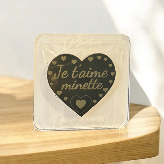 Découvrez notre cœur en laiton, fabriqué en France avec soin dans un atelier familial où cette pièce reflète notre passion pour le travail bien fait. Ce cœur en laiton allie simplicité et élégance pour offrir un cadeau intemporel et significatif. Ce cœur de 3.5 cm x 3.5 cm est collé sur un support magnétique noir mat, blanc, transparent ou transparent feuilles d'or et est présenté dans une boîte raffinée, accompagné d’une carte à gratter, à coller, afin de créer un effet surprise à la personne à qui il est destiné. Cette touche personnelle transforme chaque boîte en un souvenir unique et chargé d’émotion. En choisissant notre cœur en laiton, vous soutenez un savoir-faire local et familial tout en offrant un symbole d’amour et de durabilité, parfait pour toutes les occasions spéciales. Vous avez la possibilité de choisir nos cœurs parmis les modèles standards ou de le faire personnaliser.